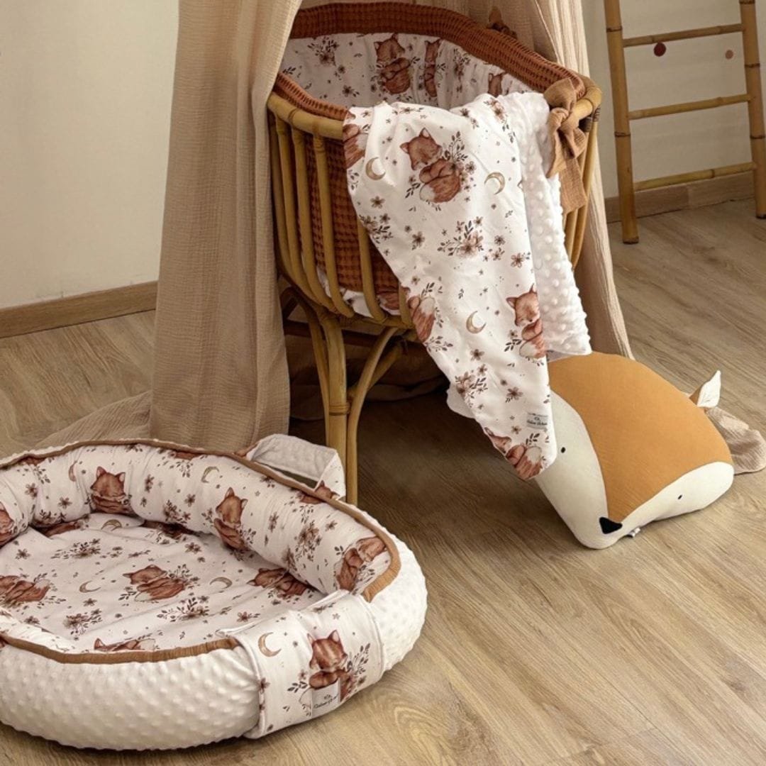 Χειροποίητη Βρεφική Φωλιά μωρού Little Fox με latex στρώμα. Αρκετά μεγάλη ώστε να μπορεί να χρησιμοποιηθεί για το μωράκι σας έως και τους πρώτους 12 μήνες. Είναι κατασκευασμένη από 100% βαμβακερό ύφασμα στο εσωτερικό και απαλό βελούδο στο εξωτερικό μέρος. Λόγω της διπλής της όψης μπορείτε να γυρίζετε τη φωλιά, ώστε να έχετε τη δροσερή πλευρά το καλοκαίρι και τη πλευρά με το απαλό βελούδο το χειμώνα. Υπό αλλεργικό γέμισμα και latex στρώμα με τρύπες οι οποίες αφήνουν τον αέρα να κυκλοφορήσει προσφέροντας τη μέγιστη ποιότητα στο μωρό σας. Προσφέρει άνεση και ασφάλεια στο μωρό σας περιορίζοντας το χώρο γύρω του και προστατεύοντας το από την κύλιση και το αναποδογύρισμα.