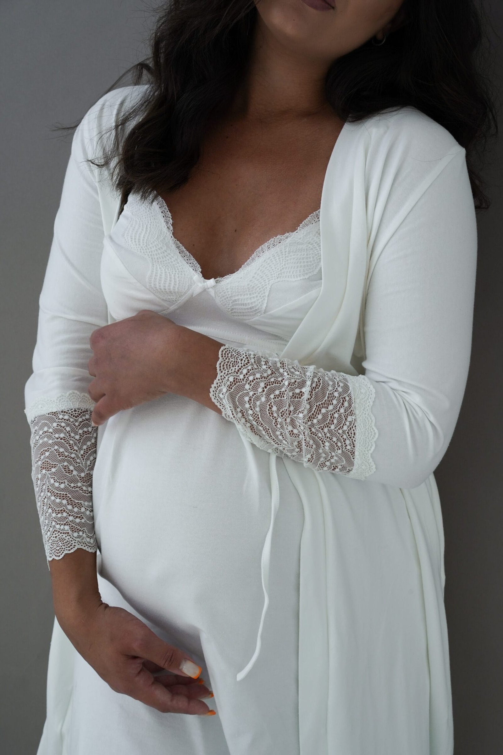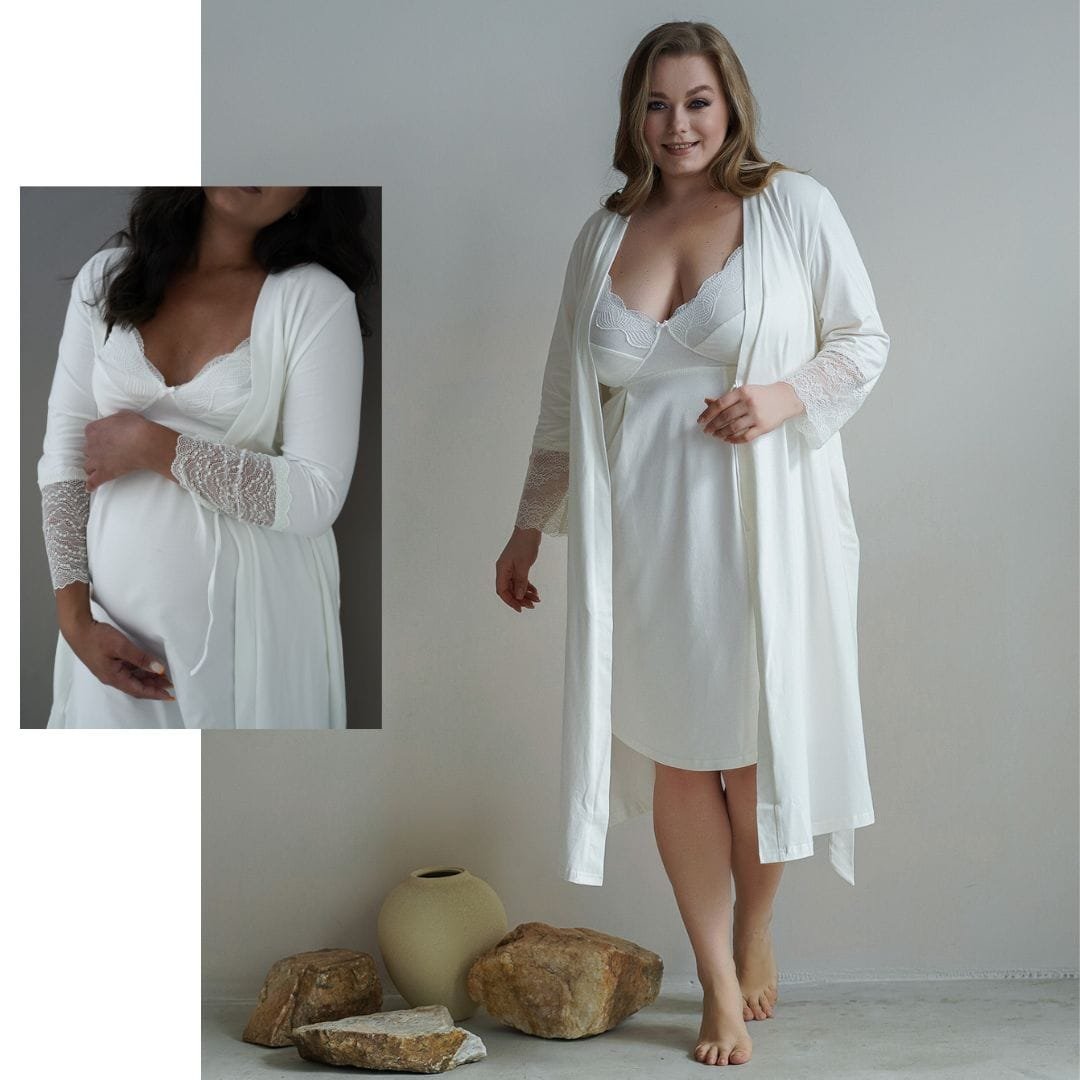 Σετ μαιευτηρίου είναι κατάλληλο για το μαιευτήριο. Νυχτικό με ελαστικές τιράντες από βαμβακερό ύφασμα. Το ειδικό κόψιμο παρέχει τη μέγιστη στήριξη του στήθους κατά τη διάρκεια του ύπνου, την ώρα της ανάπαυσης και του θηλασμού με ειδικό κλιπ για το τάισμα του μωρού. Η επένδυση από δαντέλα τονίζει το ντεκολτέ.